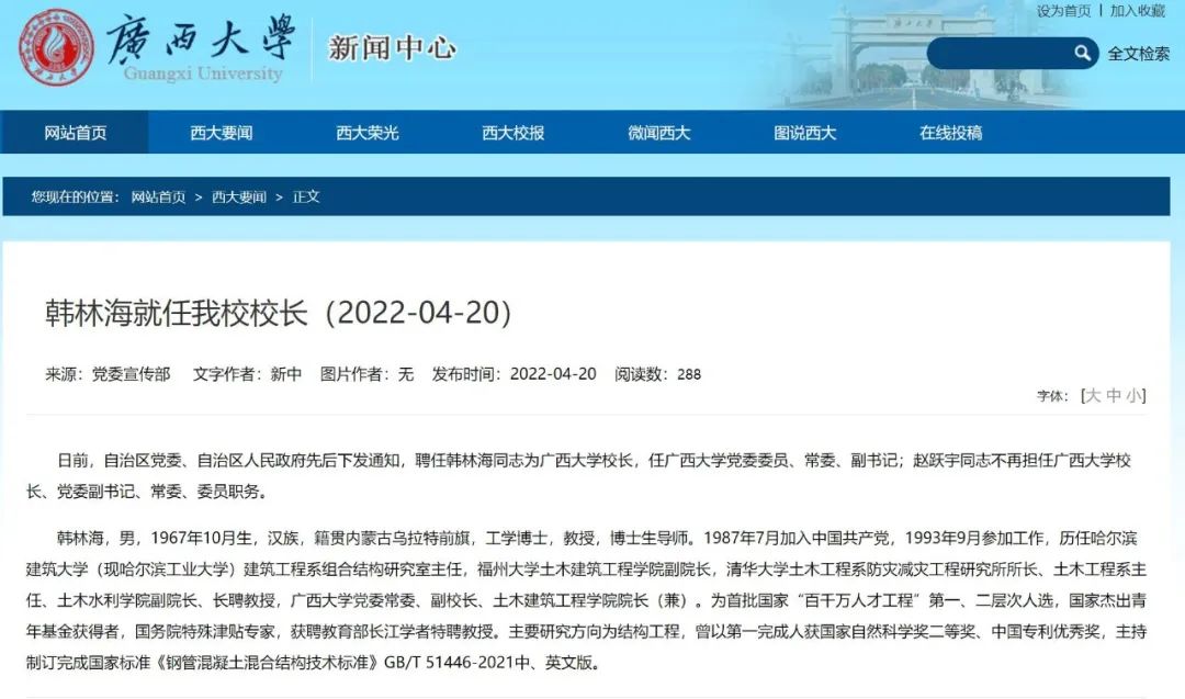 日前,自治區黨委、自治區人民政府先后下發通知,聘任韓林海同志為廣西大學校長,任廣西大學黨委委員、常委、副書記;趙躍宇同志不再擔任廣西大學校長、黨委副書記、常委、委員職務。