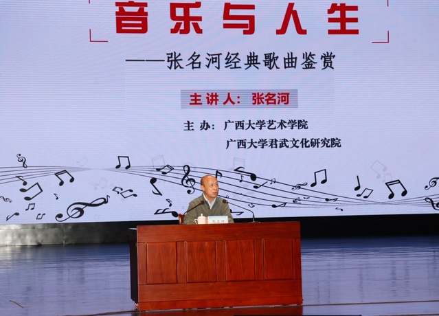 11月15日下午,全國著名詞作家、國家一級編劇張名河受邀到廣西大學開展“美育大講堂”講座,以“音樂與人生”為主題,暢談其30多年來文學藝術創作的心路歷程,并與在場400余名師生共同賞鑒了其創作的《有一個美麗的傳說》《二泉吟》《不朽的黃河》等多首膾炙人口的著名歌曲,生動地展示出一部當代中國歌曲史上“不老的傳說”。