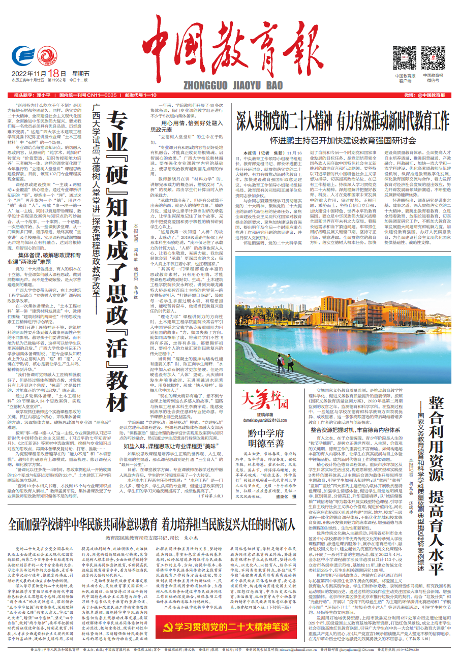 “專業課只有和思政內容恰到好處地有機融合,才能真正收到培根鑄魂、啟智潤心的效果。”廣西大學校長韓林海說,要在強化專業課教學內容的基礎上,使思想政治教育起到畫龍點睛的作用。