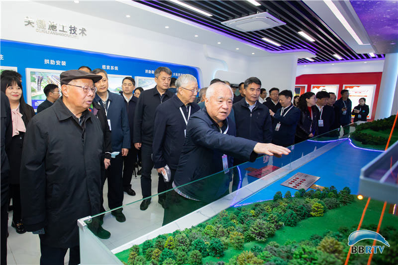中國工程院院士鄭皆連(中)向觀摩團成員介紹特大橋復雜地理環境。(廣西交投集團提供)