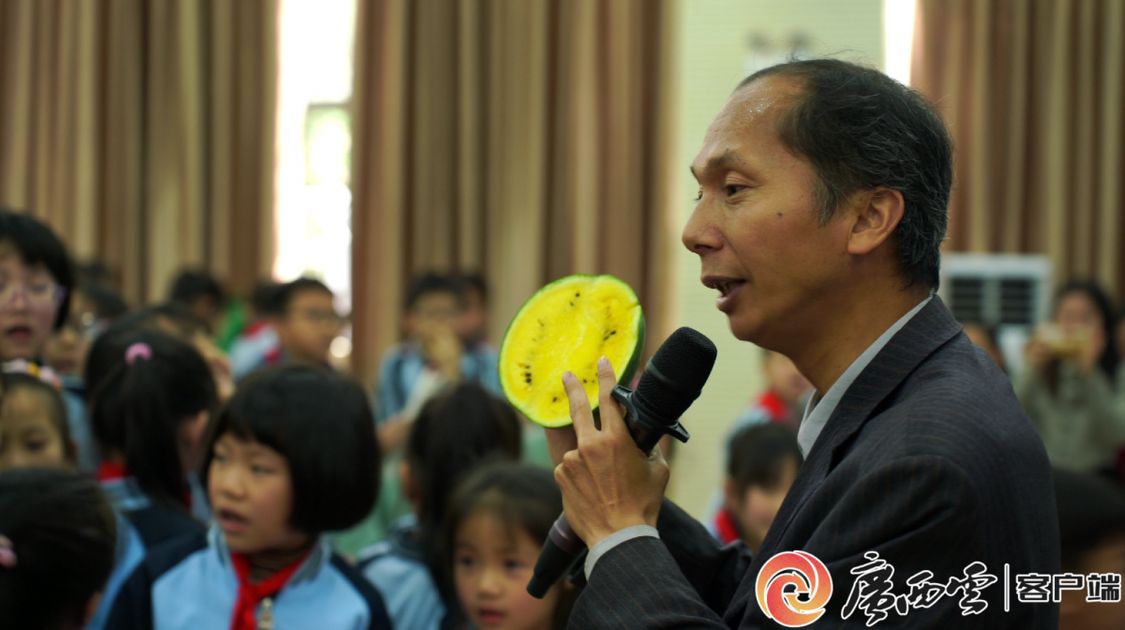 “大家知道西瓜怎么種才更甜嗎?”“怎么挑選出熟了的西瓜?”3月17日上午,在南寧市邕寧區江灣路小學的報告廳里,廣西大學農學院碩士研究生導師唐小付正在給師生們上一堂生動有趣的農業科普課,講授西瓜種植的技術。當天,廣西大學農學院農業科普進校園活動在江灣路小學開展。
