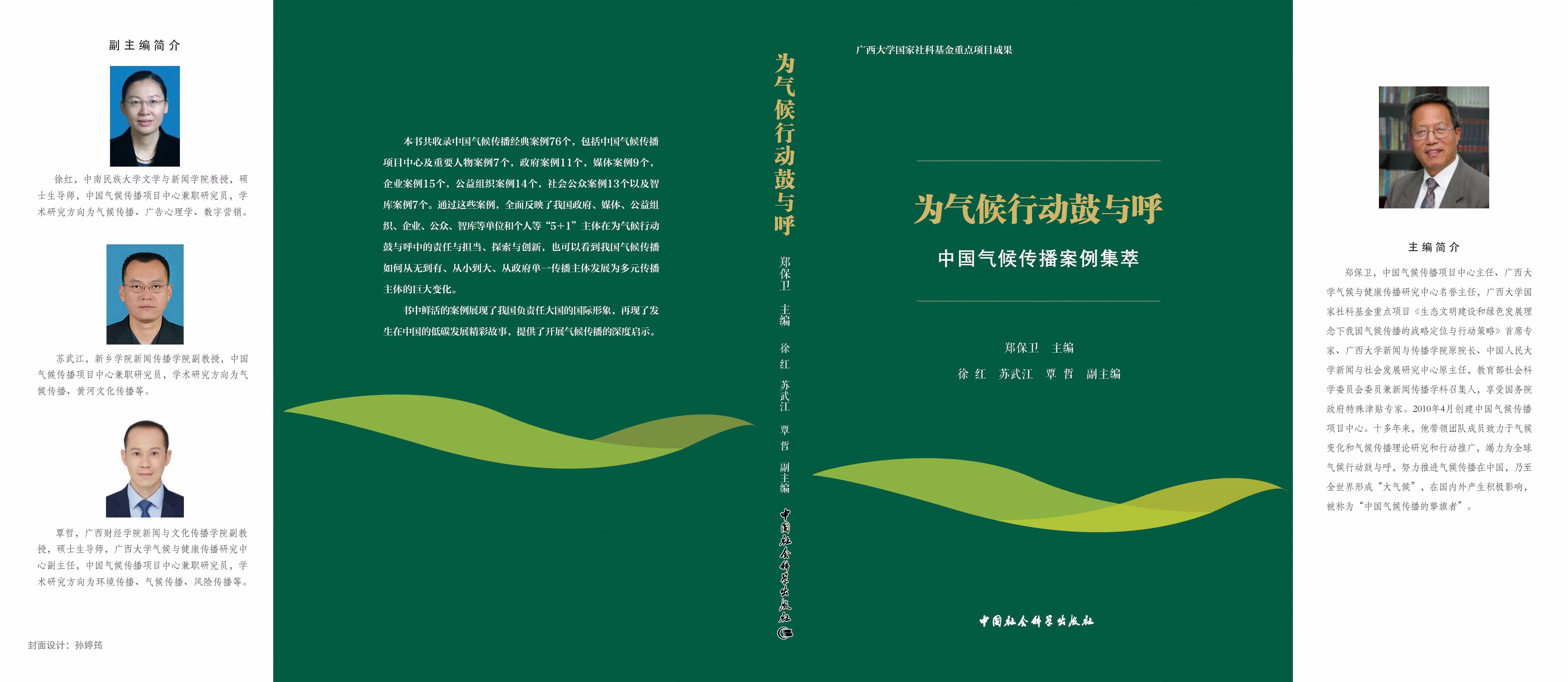 由中國氣候傳播項目中心主任、廣西大學特聘君武榮譽教授、中國人民大學新聞與社會發展研究中心原主任鄭保衛教授主編的《為氣候行動鼓與呼——中國氣候傳播案例集萃》一書,近期已由中國社會科學出版社。此書是鄭保衛教授主持的廣西大學國家社科基金重點項目《生態文明建設和綠色發展理念背景下我國氣候傳播的戰略定位與行動策略》(19AXW006)的研究成果之一。徐紅、蘇武江、覃哲為該書副主編。