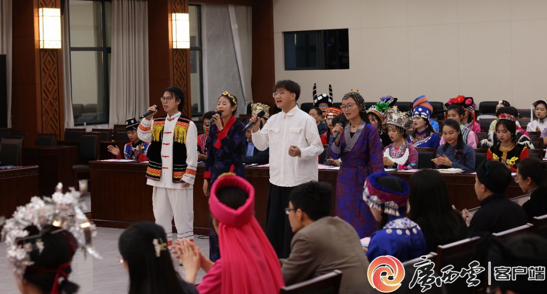 在漢族學生楊佩宜、壯族學生覃銘瑋、藏族學生赤列卓瑪和土旦旺姆的帶動下,與會師生唱響歌曲《再唱山歌給黨聽》,用歌聲表達了感黨恩、聽黨話、跟黨走的堅定信念。