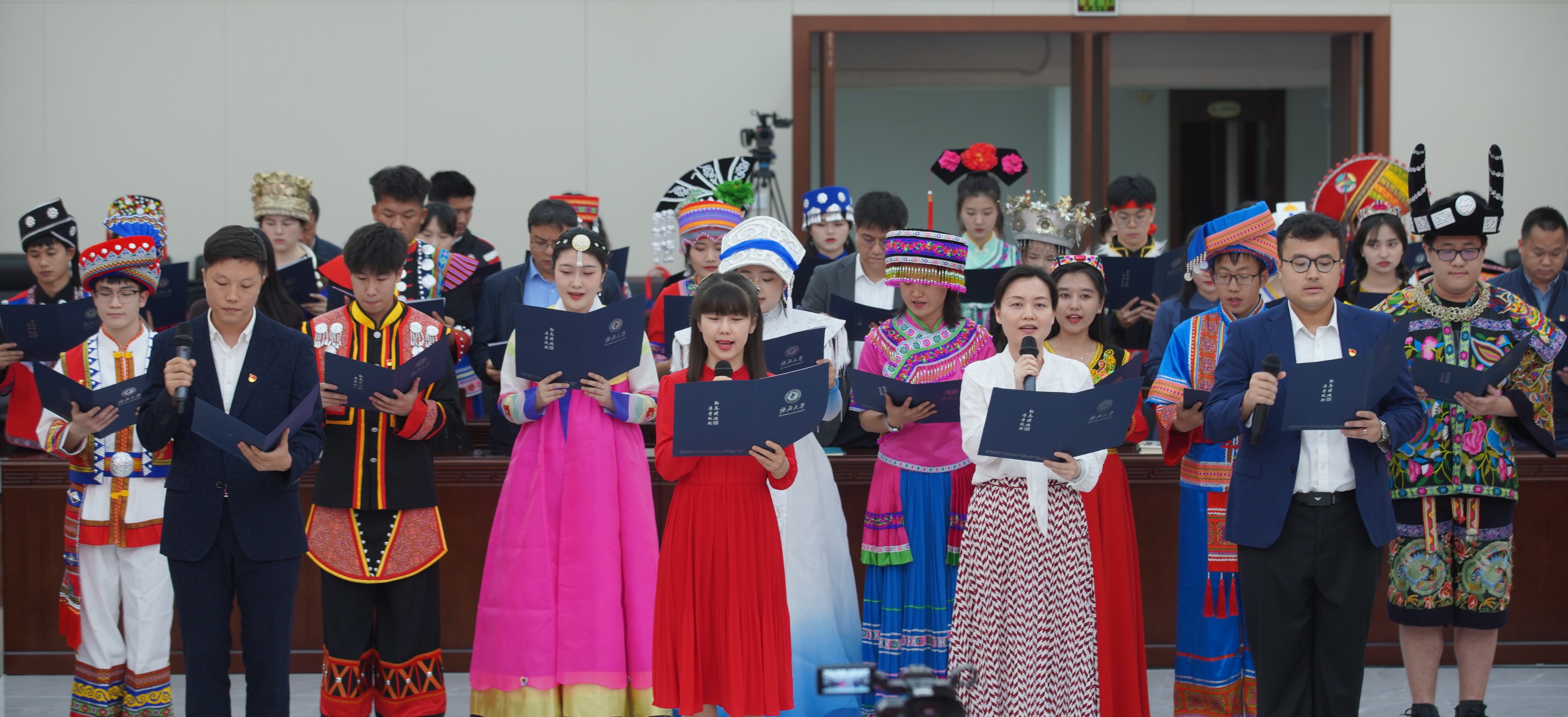 “我在一顆石榴里看見我的祖國,碩大而飽滿的天地之果……”近日,在廣西大學君武樓玉林廳,48位不同民族的師生代表,用深情的詩朗誦拉開了廣西大學2023年鑄牢中華民族共同體意識主題宣傳教育活動啟動儀式暨師生座談交流會的序幕。全校26個學院100余名師生代表在壯族“三月三”即將到來之際,身著民族盛裝,歡聚一堂,共唱民族團結之歌、共享民族進步之果、共話民族工作之策。