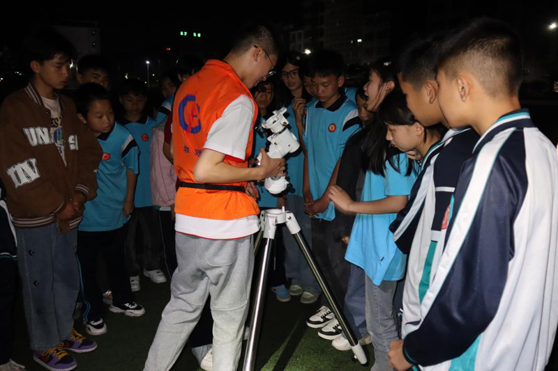 隨后,志愿團(tuán)成員和同學(xué)們走出教室,一起開展戶外素質(zhì)拓展活動。“用雙面膠將尾翼纏繞幾圈固定,再將兩個瓶子纏繞固定在一起……”團(tuán)隊(duì)成員指導(dǎo)同學(xué)們利用廢棄飲料瓶制作水火箭并進(jìn)行發(fā)射。在星空下,志愿團(tuán)將天文科普課堂“搬到”操場。在講解了望遠(yuǎn)鏡的構(gòu)造、觀測技巧以及注意事項(xiàng)等內(nèi)容后,志愿團(tuán)成員帶領(lǐng)同學(xué)們動手安裝望遠(yuǎn)鏡、調(diào)試設(shè)備。在志愿團(tuán)成員的指導(dǎo)下,同學(xué)們不僅完成了望遠(yuǎn)鏡安裝,還觀測到了金星。