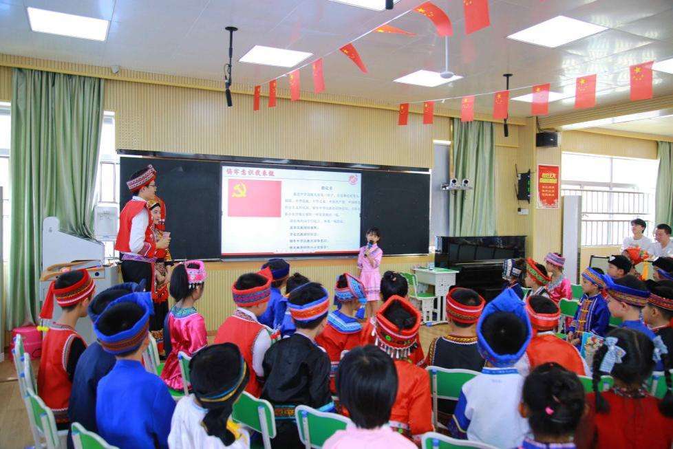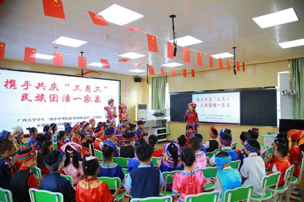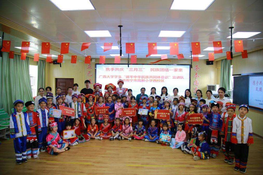 4月19日,廣西大學學生“鑄牢中華民族共同體意識”宣講隊走進南寧市高新小學西校區開展“攜手共慶‘三月三’,民族團結一家親”的主題活動。
