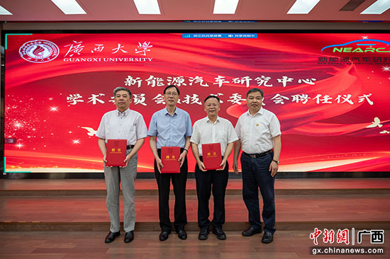 廣西大學黨委常委、副校長肖建莊為廣西大學新能源汽車中心學術委員會頒發聘書。廣西大學機械工程學院供圖
