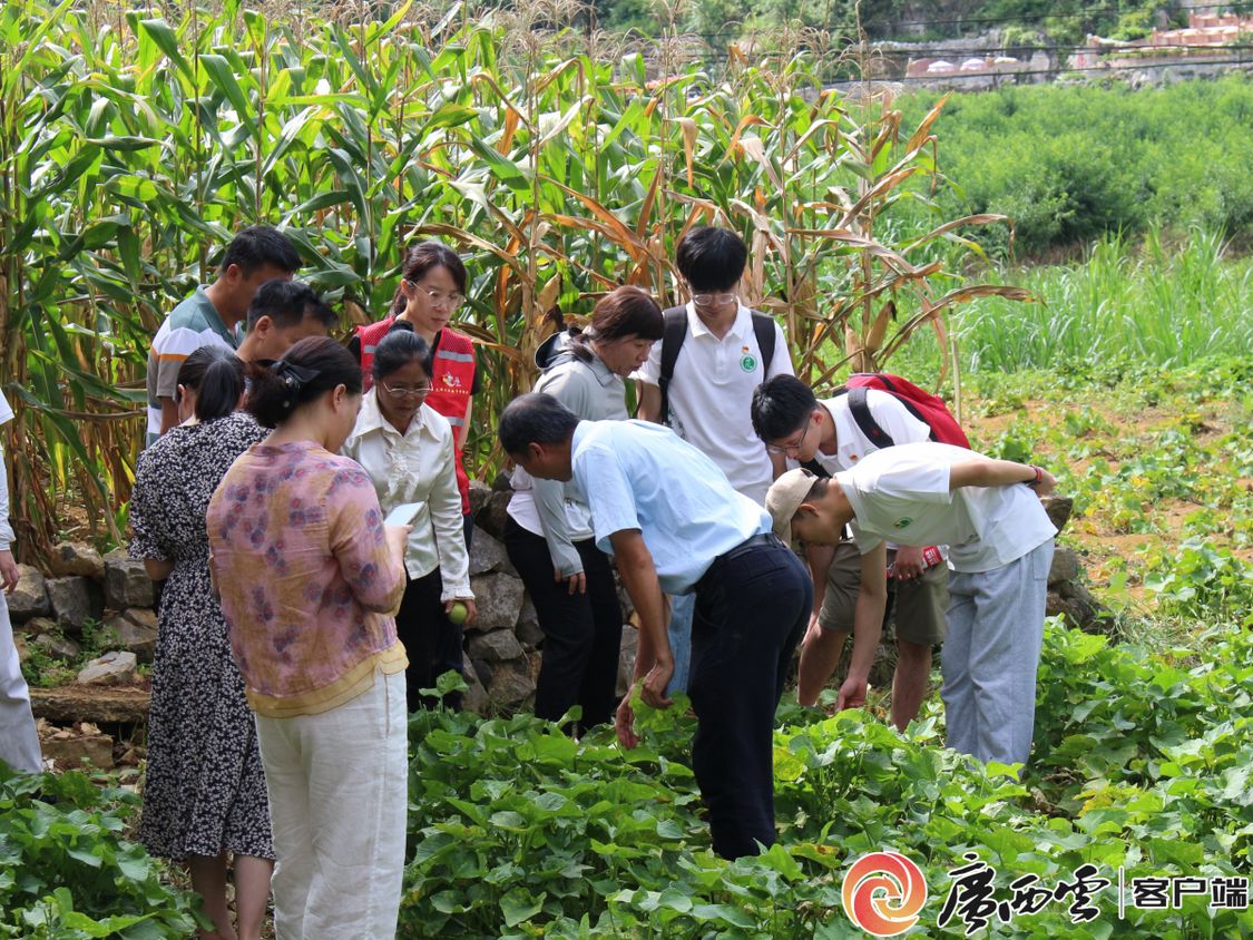 實踐隊查看古棠村佛手瓜苗長勢。廣西大學農學院供圖