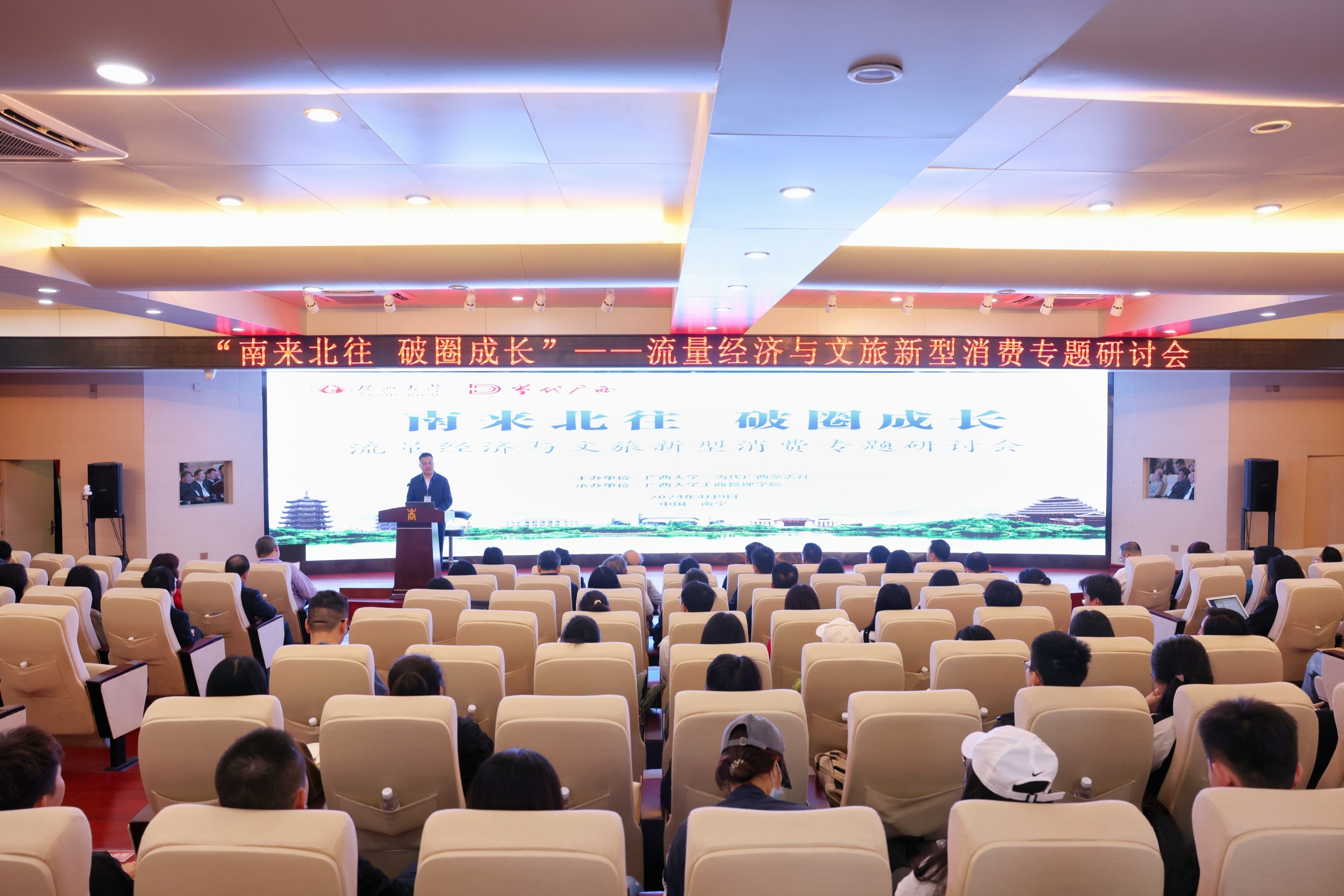 4月9日,由廣西大學(xué)、當(dāng)代廣西雜志社主辦的“南來(lái)北往 破圈成長(zhǎng)”——流量經(jīng)濟(jì)與文旅新型消費(fèi)專題研討會(huì)在廣西大學(xué)工商管理學(xué)院舉行。來(lái)自中山大學(xué)、哈爾濱工業(yè)大學(xué)、黑龍江大學(xué)、湖北大學(xué)、廣西大學(xué)、陜西師范大學(xué)等國(guó)內(nèi)10余所高校以及廣西壯族自治區(qū)文化和旅游廳、廣西壯族自治區(qū)社會(huì)科學(xué)界聯(lián)合會(huì)、廣西旅游發(fā)展集團(tuán)、南寧市文化廣電和旅游局等單位的專家學(xué)者及廣西大學(xué)師生近100人匯聚一堂,熱烈探討。