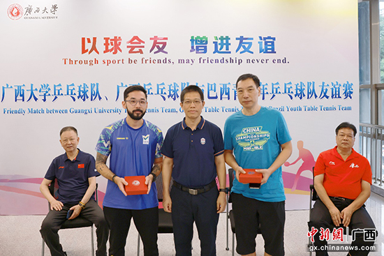 乒乓球是廣西大學的傳統優勢體育項目,在全國大學生錦標賽中曾獲混雙冠軍、團體前三名等成績,學校和自治區體育局是校局共建單位。此次巴西青少年乒乓球隊前來廣西訓練,學校以此契機舉辦友誼賽,一來以球會友、增進友誼,加強了學校體育事業的國際合作;二來也為即將出征今年全國大學生錦標賽的學校乒乓球隊進行賽前熱身。賽前的歡迎儀式上,廣西大學向客人贈送了紀念品,隨后雙方乒乓球運動員進行了單打、雙打、混雙等項目的比拼。