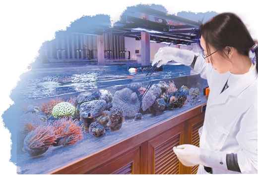 科研人員在島礁生態修復實驗室中呵護珊瑚成長。廣西云-廣西日報記者 付瑋燁 攝
