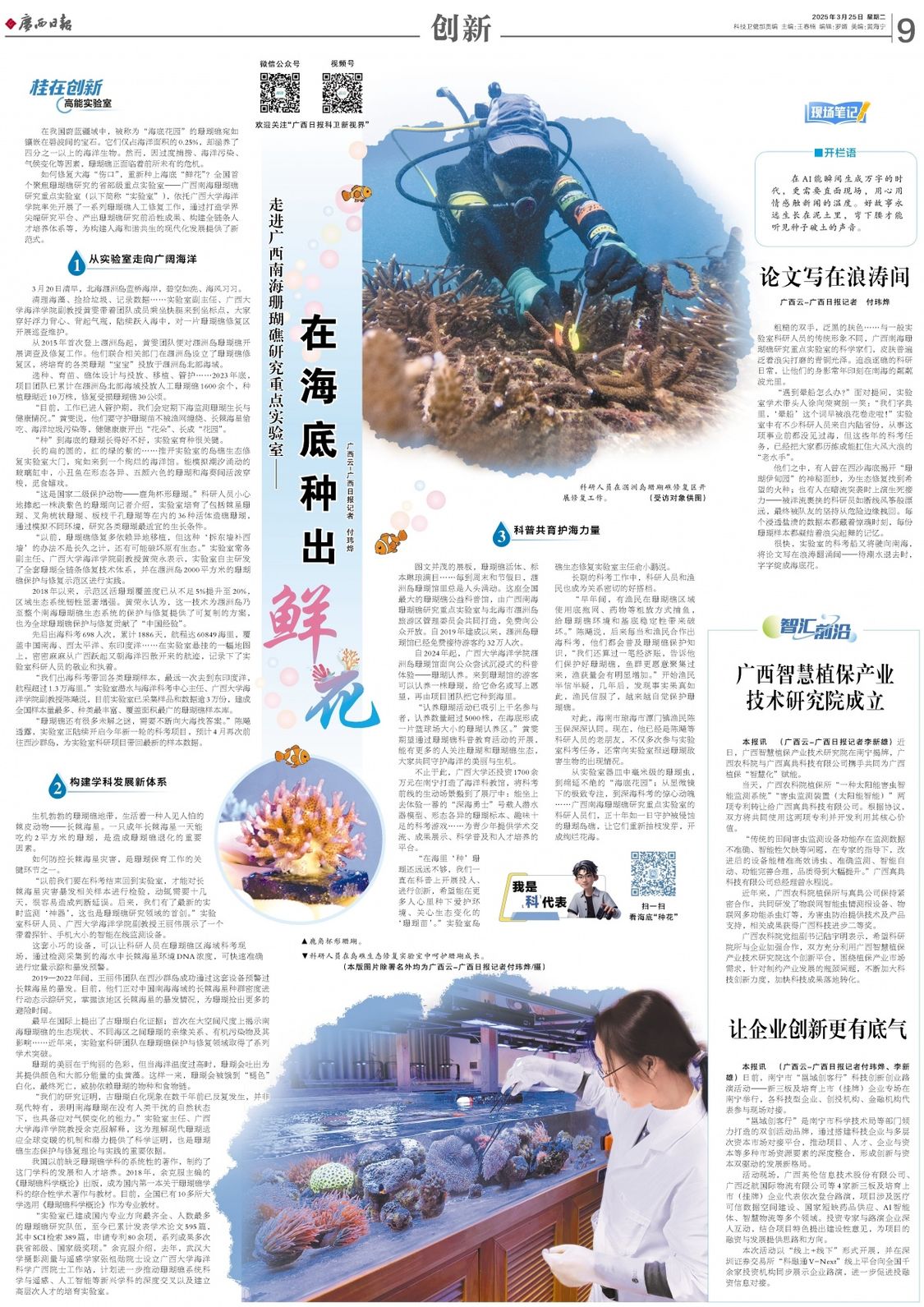 粗糙的雙手,泛黑的膚色……與一般實驗室科研人員的傳統形象不同,廣西南海珊瑚礁研究重點實驗室的科學家們,皮膚普遍泛著浪尖打磨的青銅光澤。追浪逐礁的科研日常,讓他們的身影常年印刻在南海的粼粼波光里。