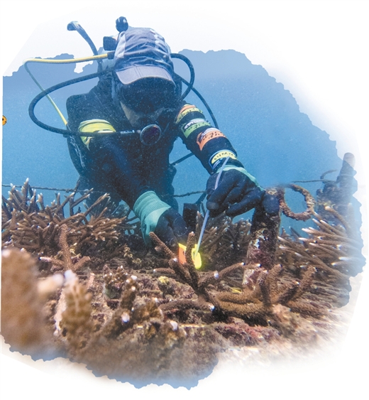 科研人員在潿洲島珊瑚礁修復區開展修復工作。實驗室供圖