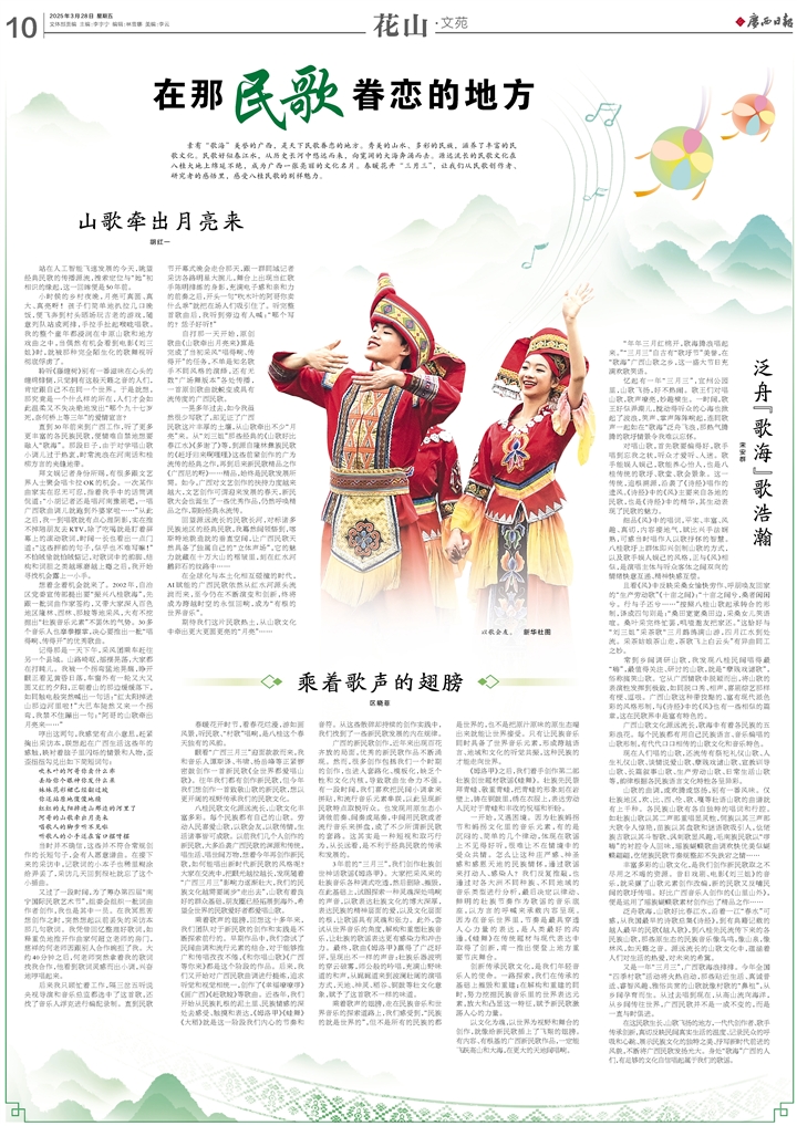 一晃多年過去,如今我雖然很少寫歌了,卻見證了廣西民歌這片豐厚的土壤,從山歌牽出不少“月亮”來。從“劉三姐”那些經(jīng)典的《山歌好比春江水》《多謝了》等,到源自隆林彝族民歌的《趕圩歸來啊哩哩》這些前輩創(chuàng)作的廣為流傳的經(jīng)典之作,再到后來新民歌精品之作《廣西尼的呀》……精品,始終是民歌發(fā)展所需。如今,廣西對文藝創(chuàng)作的扶持力度越來越大,文藝創(chuàng)作可謂迎來發(fā)展的春天,新民歌大會也誕生了一些優(yōu)秀作品,仍然呼喚精品之作,期盼經(jīng)典永流傳。