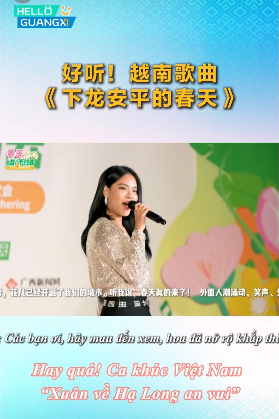 廣西藝術學院的越南留學生們在由廣西國際傳播中心主辦,廣西云數字媒體集團承辦的“春天‘友’個約會”2025中國—東盟青年春日聯歡會上大放異彩。裴香銀作詞作曲并深情演唱《下龍安平的春天》,如清泉般的歌聲讓人感受到越南春日的美好;她還與武秋安合唱了越南語版的《青花瓷》,柔美的聲線與中國風歌詞交織,令人耳目一新。