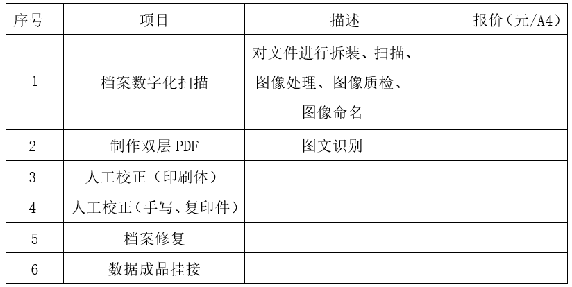對檔案掃描、制作雙層PDF、人工矯正(印刷體、手寫、復(fù)印件等)、掛接、檔案修復(fù)等項目進行報價。