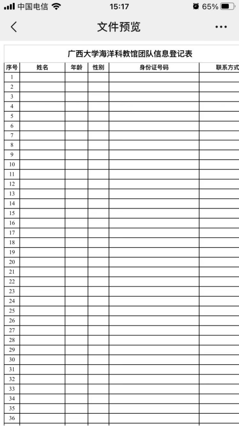 5. 預約申請提交后,可先準備團隊預約承諾書和人員登記表,點擊“廣西大學海洋科教館團隊預約承諾書”或“廣西大學海洋科教館團隊信息登記表”,轉發至微信對話框中(推薦“文件傳輸助手”),下載后按要求填寫預約承諾書和人員登記表內容,填寫完成后發送給館內工作人員,由工作人員審核。