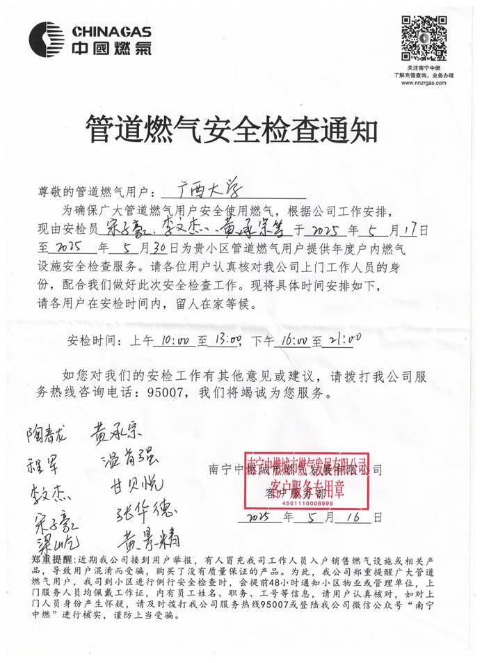 為保障校內燃氣用戶的用氣安全,后勤基建處聯系南寧中燃城市燃氣發展有限公司開展本年度第二次管道燃氣入戶安全檢查,請各住戶于2025517日至30日期間做好相關配合工作,現將具體通知如下: